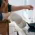 大きめの鍋を掴む時に火傷しがちな手首まできちんとカバーしてくれる、長めのデザインのミトンです。しっかりと掴んでも熱が伝わりにくい中綿入りですが厚手すぎない為、オーブンからバットやココットを取り出す作業もしやすいデザインになっています。